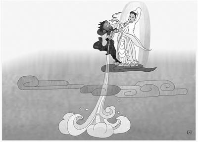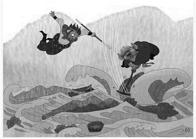 六、八戒来帮忙 “乡亲们呐,俺把甘露请回了” 孙猴儿扭头,却被眼前的情景吓傻了 地没了,树没了,洪水连天成灾了 天塌了!猴儿急了:“八戒快来帮哥哥!” 八戒闻声到,抡起了耙子 东一耧、西一耧、南一耧、北一耧 耙起泥沙走,耙落水顺流 天上几滴水人间流成河 |
