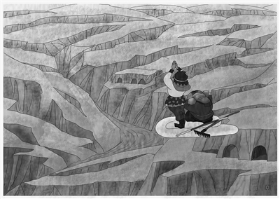 七、积水退去 看不到边的大平川 硬让八戒耧成了横七竖八的沟沟壑壑 “这可咋了得” 哥俩儿求天赎罪过 人往高处走,住进沟坎崖畔生出的土窑洞里边 黄土塬总得长眼窝 水往低处流,积水最终汇成黄河 天天念诵着黄土高原和黄河的传说 |