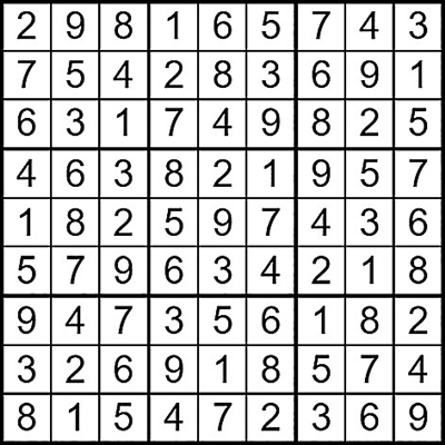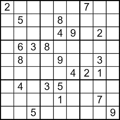 在每个小格子里填入1-9中的数字,使得每个数字在“九宫阵”的每行、每列、每个宫格中均只出现一次。(答案→)