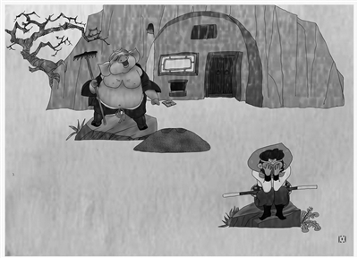四、在很早很早之前的一天 太阳瞪着独眼,跟火球一般 孙猴儿心里不安手搭凉棚看人间 它簇簇鼻子 突然闻到不对劲,赶紧窜到地面 落地一看,额的天! 地面的烫土埋过小腿,把孙猴的沟子(屁股)烫得冒了烟 “乡亲们啊,大旱咋不早言传” 见不得百姓受苦受难,孙猴儿一个跟斗冲上天 |