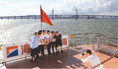 近日,游客在广东珠海乘游船与港珠澳大桥合影留念。暑期来临,珠海在做好疫情防控的同时,有序开放海上观赏港珠澳大桥之旅,吸引游客前来体验。