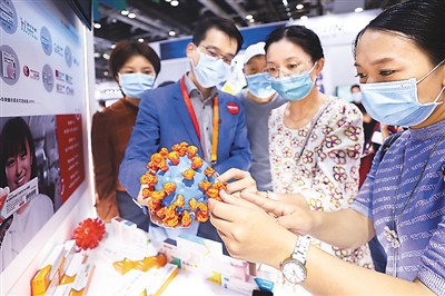 图二:9月6日,观众在服贸会综合区了解新型冠状病毒。 |
