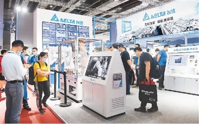 第二十二届中国国际工业博览会近日在上海国家会展中心开幕,台湾知名企业台达集团以“互联生智赋能新基建”为主题参展。图为台达关于“智能制造”“智慧城市”的现场布展吸引观众咨询。