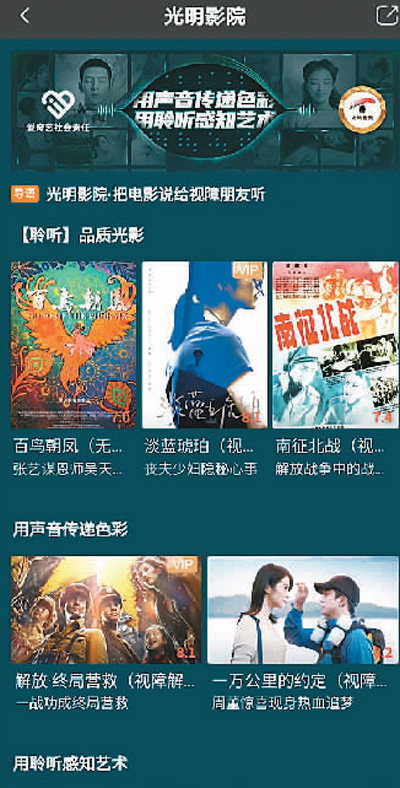 由于视力障碍,视障人士生活在没有光亮和色彩的世界。他们很难通过正常视听了解社会和融入社会,观看展现社会生活、自然美景的电影。对体验过无障碍电影的视障人士而言,“光明影院”就是照亮黑暗的荧荧之光。“过去看电影,里面能看懂的东西只有10%。如今有了‘光明影院’,我100%都看懂了。”视障朋友如是说。