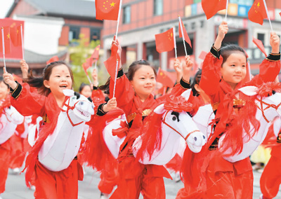 国庆中秋前夕,浙江省湖州市长兴县东鱼坊历史文化街区,孩子们手舞五星红旗,欢跳马灯舞。 谭云俸摄(人民视觉)