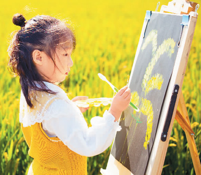 10月14日,江苏省如皋市小朋友在金色的稻田里“画丰收”。 |