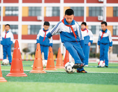 图为12月1日,山东省青岛市即墨区龙山中心小学足球社团的学生在操场上训练。