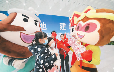 连淮扬镇高铁全线开通仪式上,西游记主题人偶与旅客互动。 |