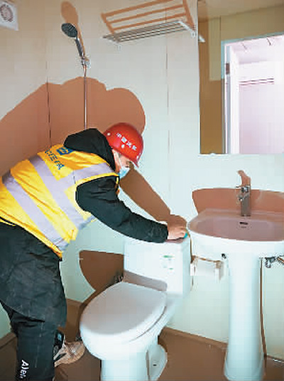 图为1月19日,工人在石家庄黄庄公寓集中隔离场所工地准备交付的房屋内安装床铺。 |