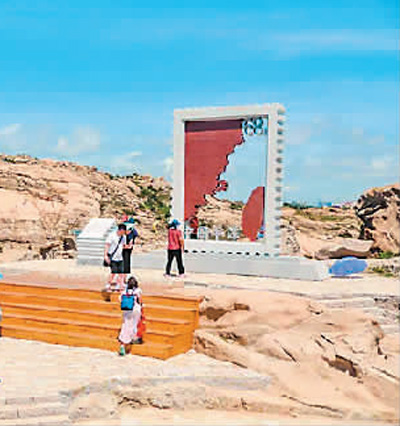 在梦山之巅,一个邮票式的门框造型,嵌有中国地图,上面“中国邮政”“68”的字样醒目,数字代表此处与台湾最近的距离。邮票造型取自诗人余光中的名句:“乡愁是一枚小小的邮票”。诗意情怀深植于几代人心,浅浅的海湾,难以阻隔两岸同胞的情谊。