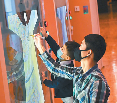 市民在展览现场体验手绘服饰图腾。