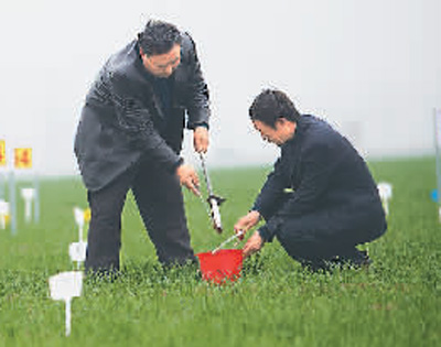 山东省邹平市农业技术人员在耕地土壤环境质量提升试验示范项目焦桥镇基地,按照取样点进行小麦土壤取样。 |