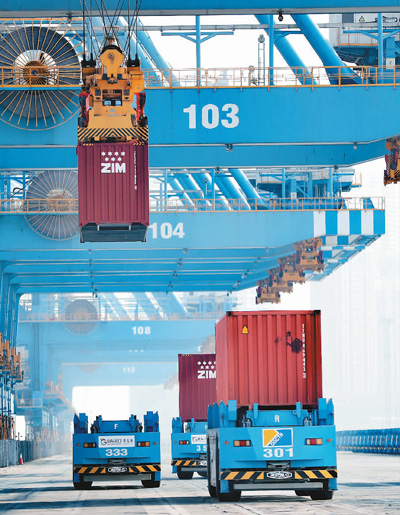 图为位于山东自贸区青岛片区的山东港口青岛港全自动化码头,自动导引车快速行进装运货物。 |