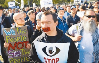 二〇一三年美国就曾被曝光监听欧盟政要。图为二〇一三年十月二十六日,美国华盛顿,上千美国民众走向美国国会,对美国国家安全局的监控行为表示抗议。 |