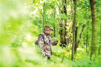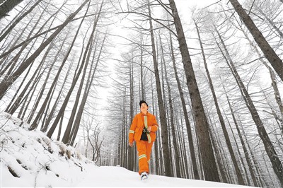 野生东北虎巡护员董红雨在迎春林业局有限公司施业区内进行巡护工作。 |