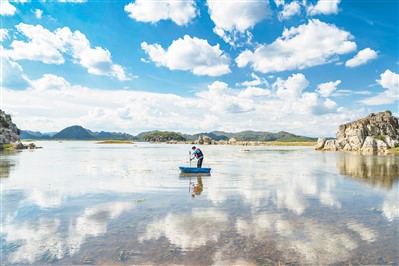 云南省曲靖市沾益区大坡乡海峰湿地巡护员清理湿地水面漂浮物。 |