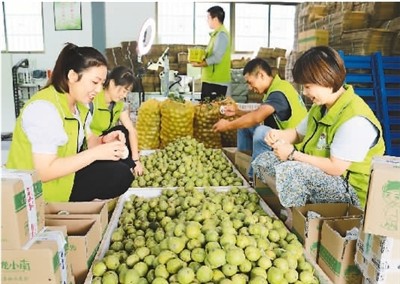 近来,甘肃省陇南市依托农户、电商、物流相互联动的电商链条,把当地近10万吨青皮鲜核桃通过电商平台销往全国各地。图为8月14日,陇南市成县陈院镇梁楼村陇小南电商基地内,员工边分拣青皮鲜核桃边直播销售。 |