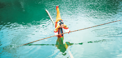 杨柳身穿苗族服饰在浮于水面的竹竿上起舞。 |