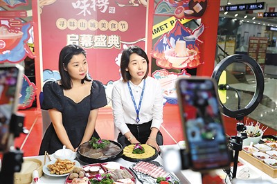 图二:8月17日,在位于重庆市沙坪坝万达广场,工作人员正在进行网络直播宣传商场美食。 |