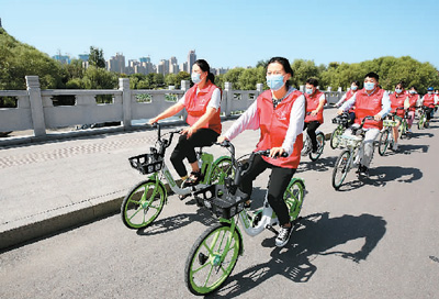 山东省枣庄市龙山路街道青年志愿者在城区道路上骑共享单车开展“低碳生活 绿建未来”宣传活动。 |