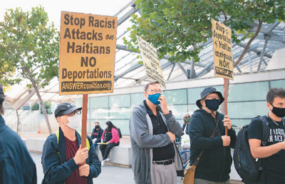 图为近日,民众在旧金山抗议美国政府驱逐海地难民。