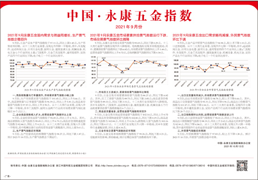 2021年9月永康五金国内需求与效益同增长,生产景气指数企稳回升