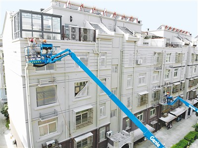 江苏省泰州市老旧小区改造工程近日已全面铺开。图为不久前,工人正在对泰州市海陵区东苑公寓小区外墙出新粉刷。 |