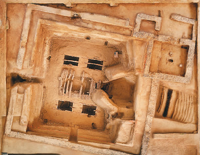 1989年,江西省新干县大洋洲商代大墓被发掘,出土了475件青铜器,754件玉器,139件陶件,将江南的文明史整整提前了1700多年。图为新干县青铜博物馆大洋洲商代大墓遗址展示。 |