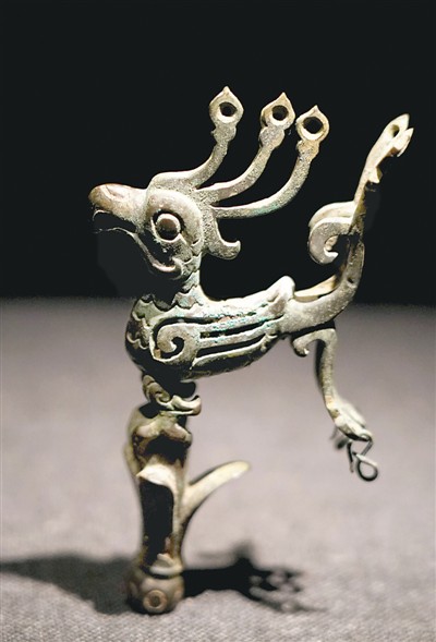 四川广汉三星堆博物馆藏文物“铜神树枝头花蕾及立鸟”。 |