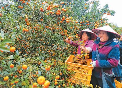 湖南省宁远县水市镇淌塘村柑桔基地近来各种柑桔相继成熟,水果直销粤港澳大湾区。图为村民在采摘。