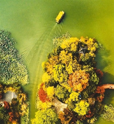 江苏省镇江市的金山湖景区又到一年赏秋季,游人泛舟在色彩斑斓的金山湖上,沉醉在历史人文景观和自然湖光山色的交融中,流连忘返。图为金山湖俯瞰。