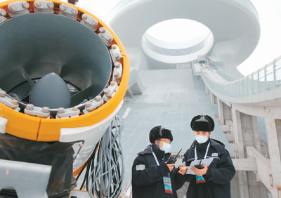 国家跳台滑雪中心的电力保障团队成员在冬奥会雪上项目测试活动期间检查电力设备运行情况。 |