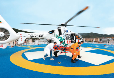 医务人员在北医三院崇礼院区的停机坪上进行病患转运演练。 |