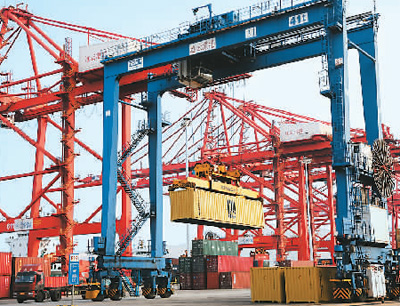 图三:12月7日,在江苏连云港集装箱码头,大型机械正在吊装集装箱。 |