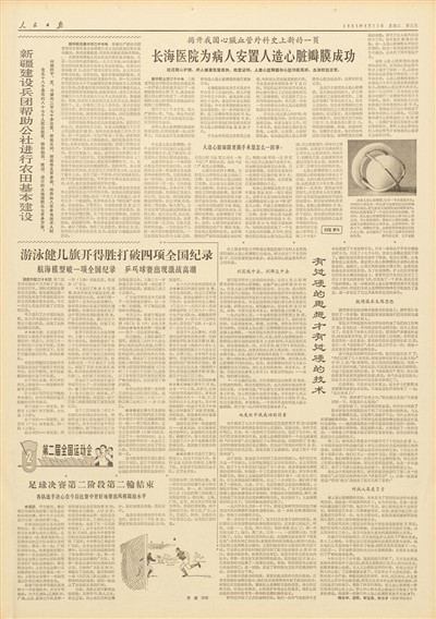 中国人不仅能造心脏瓣膜,也能自己进行精密的手术。1965年9月21日,人民日报第五版刊发报道《揭开我国心脏血管外科史上新的一页 长海医院为病人安置人造心脏瓣膜成功》,记录了朱家麟忆及的那场“无声的战斗”。