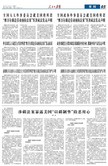 全国人大外事委员会就美国将所谓“维吾尔强迫劳动预防法案”签署成法发表声明