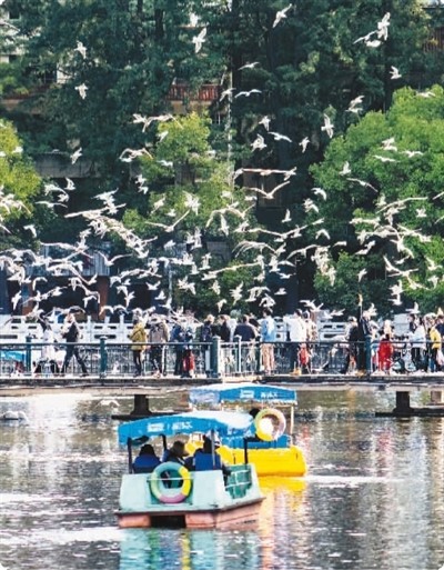 每年冬季,数万只红嘴鸥从遥远的北方飞来云南昆明越冬,翠湖公园则是昆明城区一处主要的观鸥点,漫天飞舞的红嘴鸥与欢乐的游人组成了一幅和谐美丽的画卷。