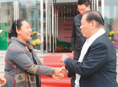 2014年8月,巴桑永吉(左)和首次前来玉树市金鹰幼儿园考察的陈江和(右)握手。 |
