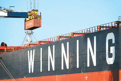 日前,在山东港口烟台港,岸桥为中非班轮“胜利优雅”轮装载货物。二〇二一年十二月,该港中非班轮对非物资年发运量首次突破百万吨大关。 |