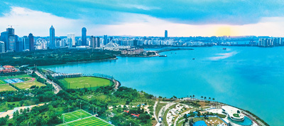 海南省海口市坚持规划引领,严守生态底线,分期推进海口湾畅通工程,还海、还岸、还景于民,因地制宜设置多样化公共服务设施,探索实践依水共生内涵式发展之路,营造优质滨水公共开放空间,让海口湾公共空间成为市民游客共享的亲水乐水、享受生活的好去处。1月10日,在金色晚霞的映衬下,湖蓝色海口湾景色迷人。 |