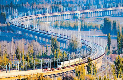 图为兰新高铁动车组列车在新疆哈密特大桥上行驶。 |