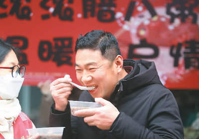 江苏省扬州市广陵区汤汪街道通运社区辖区的商贸城内,一名个体工商户在品尝社区志愿者送来的腊八粥。 |