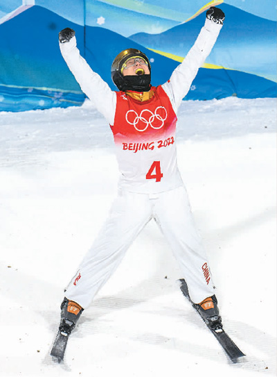 夺得冬奥会金牌的一跳,其实并不是我表现最好的。我曾经在世锦赛上拿到过139.5的高分,是空中技巧项目到目前为止的最高分。我一直希望能在北京冬奥会拿到140分以上,再刷新一次纪录。所以当我在决赛中落地,看到129分的成绩时,心里还挺忐忑的。虽然对分数不是很满意,但夺得金牌,我还是非常开心。