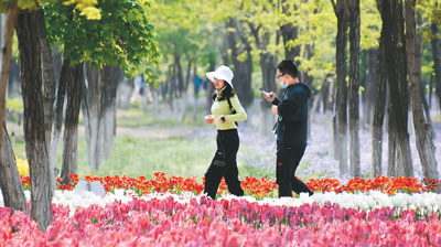 春暖花开的时节,市民到永定河畔休闲赏花。 |