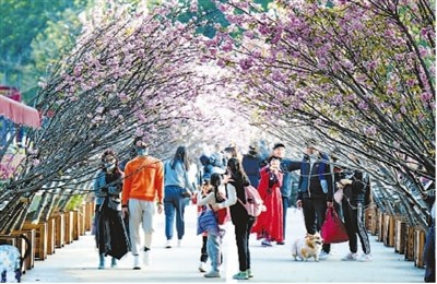 近日,深圳观澜湖樱花竞相绽放,游客纷至沓来。