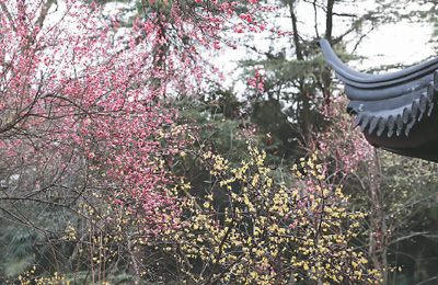 梅岗的梅花处处浸润着诗情画意。继续沿小道前行,一片梅林展现眼前。曲折的长廊,形状各异的花窗点缀其间,亭、阁、轩依廊而建,这便是由“访梅亭”“问梅阁”“寒香轩”“曲廊”组成的梅岗胜景。此处的梅花如古诗词中走出的女子,不施粉黛、优雅脱俗,远观,清丽动人;近赏,典雅端庄;观赏时,心中便有诗意随梅花盛开:“早梅发高树,迥映楚天碧。”“江南无所有,聊赠一枝春。”“和羞走,倚门回首,却把青梅嗅。”……透过花窗赏梅,视点起伏,便裁剪出一幅幅“梅花绽放动感画面”,梅枝虬曲、疏影横斜、摇曳生姿。忽然,有穿着汉服的游客走入“镜头”,素手挽纱、纸扇青衫,与梅同框,尽显古典、飘逸之美,仿佛穿越到千年之前。朵朵梅花,傲立枝头,与亭台轩榭融为一体,如诗如画。