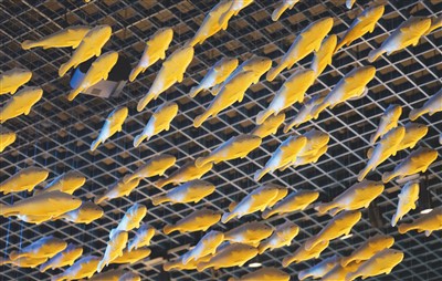 两个巨大的海洋生物水族箱让人仿佛置身海底世界,箱中展示的海洋生物标本基本根据其在海水层中的真实分布情况呈现。“这里面有舟山渔场著名的鱼种——大黄鱼和小黄鱼。”刘冬燕说,“很多人以为小黄鱼长大了就是大黄鱼,其实它们是两个完全不同的品种。”