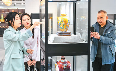 乔琳(左一)为客户介绍珐华。 |