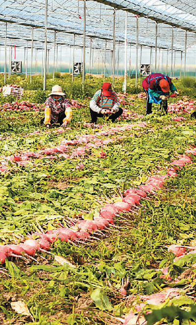 图为3月28日,农民在智慧农业产业园温室大棚内采收红萝卜。