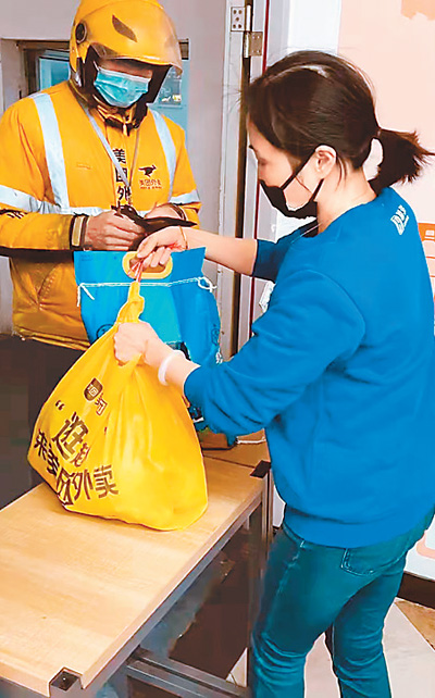 据悉,美团外卖已开通“应急帮手”服务,帮助特需人群解决困难。如果家中有老人、孕妇、残障人士等特殊群体需要帮助,美团外卖将做出高优先级响应。图为在上海市浦东新区,用户在“应急帮手”平台求助后,骑手去商家取物资。